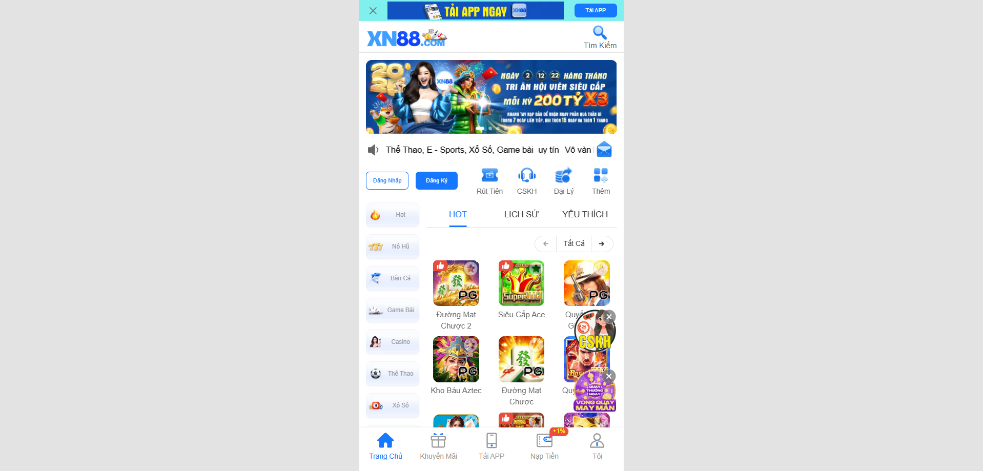 Chương trình khuyến mãi hàng ngày, hàng tuần và hàng tháng. Giá trị lên tới 88.000.000, nạp đầu tặng 120%, hoàn trả tới 3%.